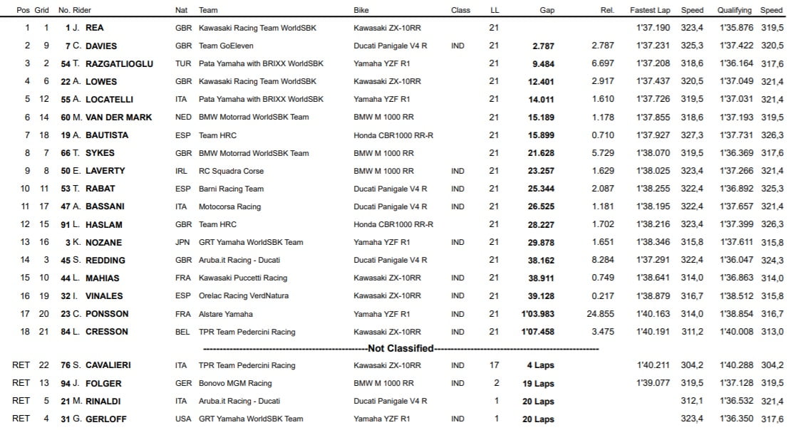 La seconde partie de l’épreuve ne fut qu’une promenade de santé pour Rea, vainqueur facile devant un Chaz Davies méritant et parti depuis la neuvième position sur la grille. La performance de Razgatlioglu mérite elle-aussi d’être mentionnée, le pilote Yamaha qui a su se remobiliser après sa doublé pénalité pour remonter en troisième position et signer un troisième podium en autant de courses ce weekend.