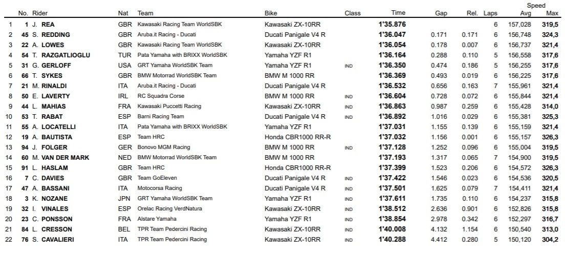 Razgatlioglu s’est emparé pour sa part de la quatrième place devant Garrett Gerloff et Tom Sykes, alors que la troisième ligne est quant à elle composée de Michael Ruben Rinaldi, Eugene Laverty et Lucas Mahias, auteur au final d’une prometteuse neuvième place.
