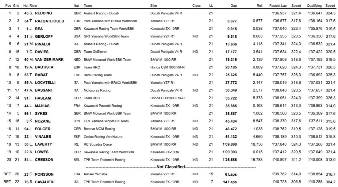 Le pilote Ducati a pris les commandes de la Course 1 dès le départ pour ne plus en départir. Derrière lui, un duel épique a opposé Toprak Razgatlioglu et Jonathan Rea, qui a tourné finalement à l’avantage du premier cité.