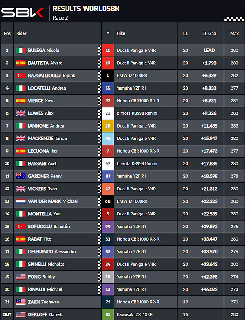 Sur le circuit andalou, le pilote Ducati a survolé le week-end : essais dominés, record absolu de la piste pulvérisé et trois courses menées tambour battant. À Jerez, personne n’a pu rivaliser, pas même Razgatlioglu. En revanche, chez Ducati, on pourra nourrir quelques regrets : les points perdus à cause des deux abandons à Assen pour des soucis techniques, et surtout l’accrochage de Misano provoqué au premier virage par Axel Bassani.