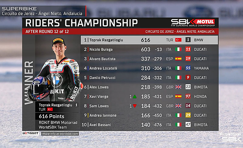 Il lui suffisait d’un treizième rang pour être couronné, et avec son talent, il ne faisait guère de doute que seul un nouvel incident aurait pu remettre en cause un championnat déjà verrouillé depuis la fin du printemps. Bulega a tout tenté, sans ménagement ni calcul, mais l’écart de points était tout simplement trop important pour espérer renverser la situation.