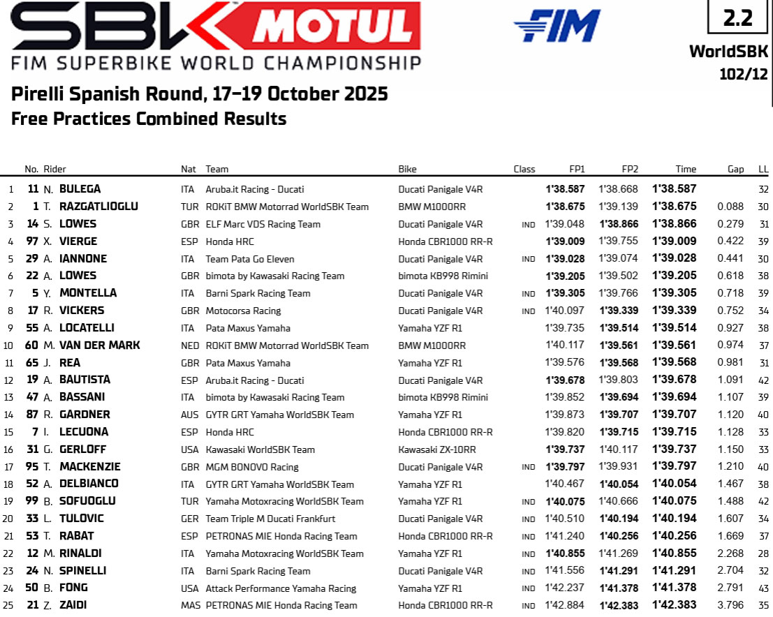 La journée n’a toutefois pas été parfaite pour Nicolo Bulega puisqu’il a perdu du temps lors de la deuxième séance d’essais libres en raison d’un problème technique sur sa Ducati Panigale V4R. Le problème a été rapidement identifié et l’Italien est revenu en piste pour signer son meilleur temps lors de son dernier tour de la séance de l’après-midi.
