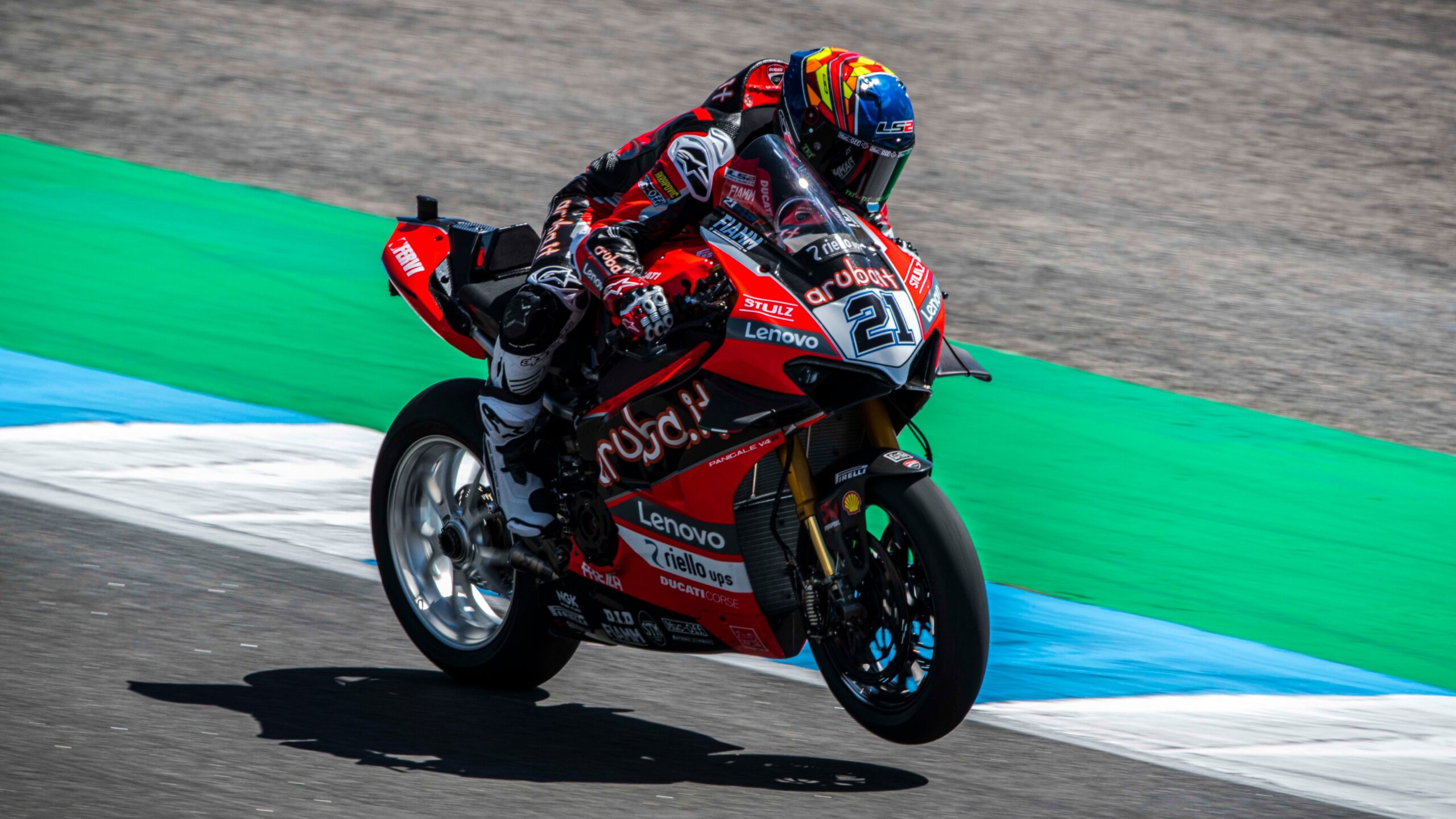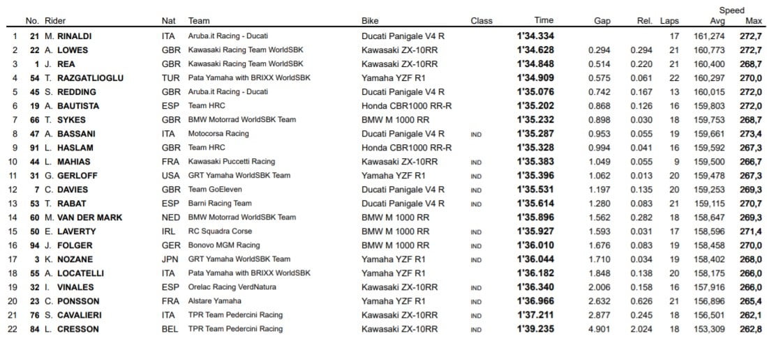 Álvaro Bautista s’empare de son côté de la sixième place, et peut se féliciter d’avoir réalisé un vendredi de bien meilleure facture qu’il y a deux semaines à Estoril, lorsqu’il avait chuté à trois reprises lors de la première journée. L’Espagnol devance Tom Sykes et Axel Bassani, alors que Leon Haslam et Lucas Mahias bouclent le top 10. Le Français a plutôt très bien limité les dégâts après une chute survenue dans le virage 16 en début de séance, et devance Garrett Gerloff et Chaz Davies.