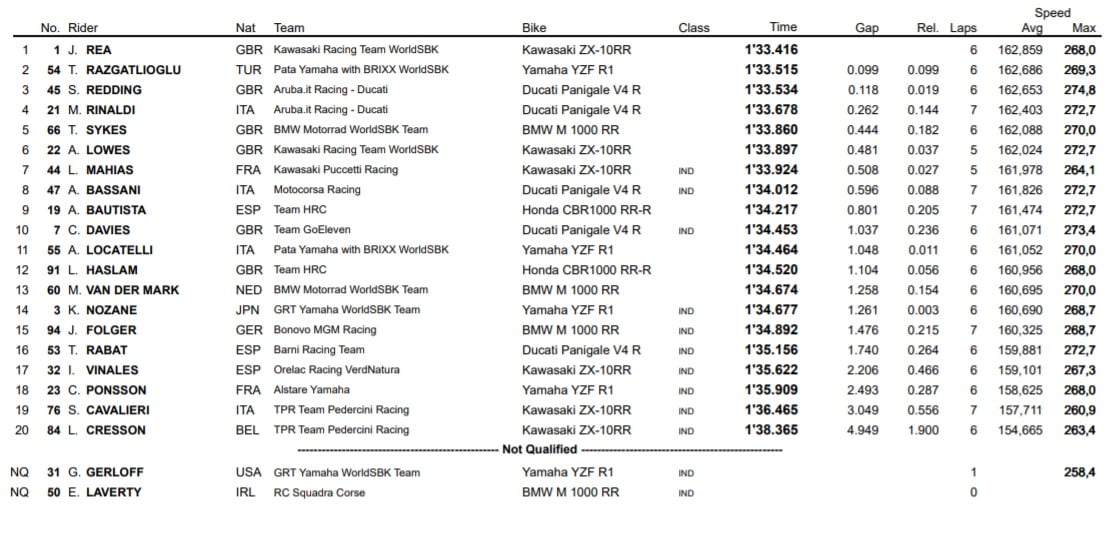Deux pilotes n’ont pas inscrit le moindre temps au cours de cette Superpole : Garrett Gerloff et Eugene Laverty. Le premier cité a été victime d’une chute sans conséquence au cours de la séance dans le virage 1, alors que le second a dû déclarer forfait suite à son gros accident survenu lors des FP3. Le Nord-Irlandais continue d’observer une batterie d’examens pour juger de son état physique et de sa capacité à prendre part à la Course 1.