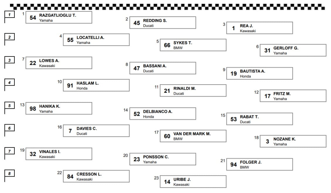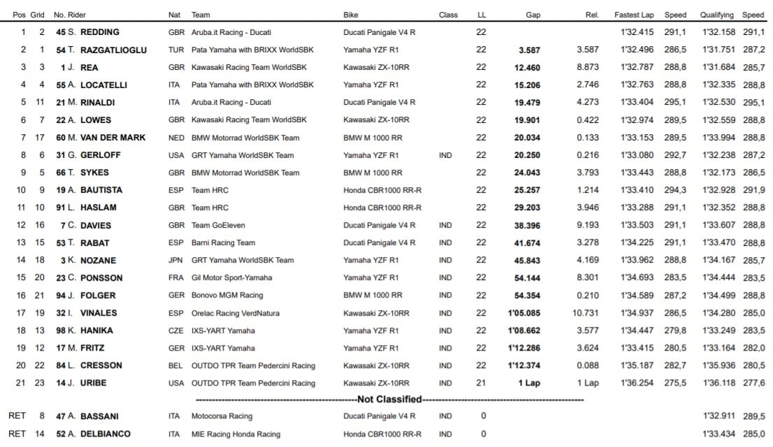 Le pilote italien devance Michael Ruben Rinaldi, cinquième, et Alex Lowes. Michael van der Mark a quant à lui redressé la barre après une première partie de weekend très difficile, terminant la course en septième position devant Garrett Gerloff, Tom Sykes et Álvaro Bautista. On retrouve ensuite au-delà du top 10 Leon Haslam et Chaz Davies, devant Tito Rabat, Kohta Nozane et Christophe Ponsson, qui termine à la 15e place et inscrit ainsi un nouveau point à son compteur au championnat.