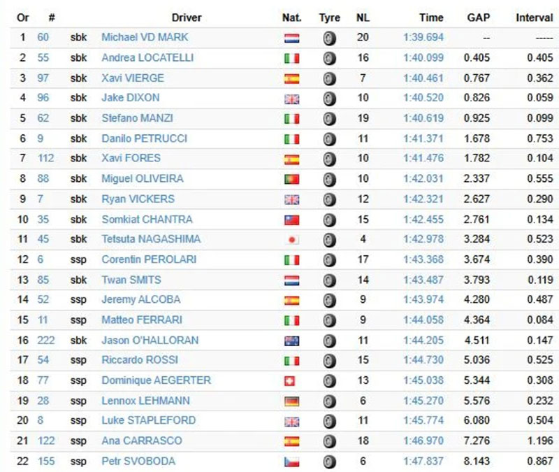 A midi, le pilote d’essai BMW Michael van der Mark tenait la barre en 1’39.694 devant Andrea Locatelli.