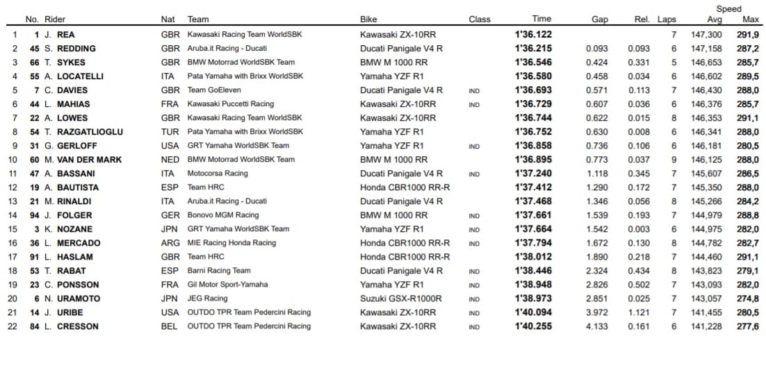 Les événements se sont accélérés dans les deux dernières minutes, Chaz Davies faisant un passage surprise en première position avant que Locatelli ne refasse son apparition en tête. Sykes y allait également de son meilleur tour, au même titre que Redding, mais c’est finalement Rea qui allait avoir le dernier mot avec une ultime amélioration en 1’36.122.