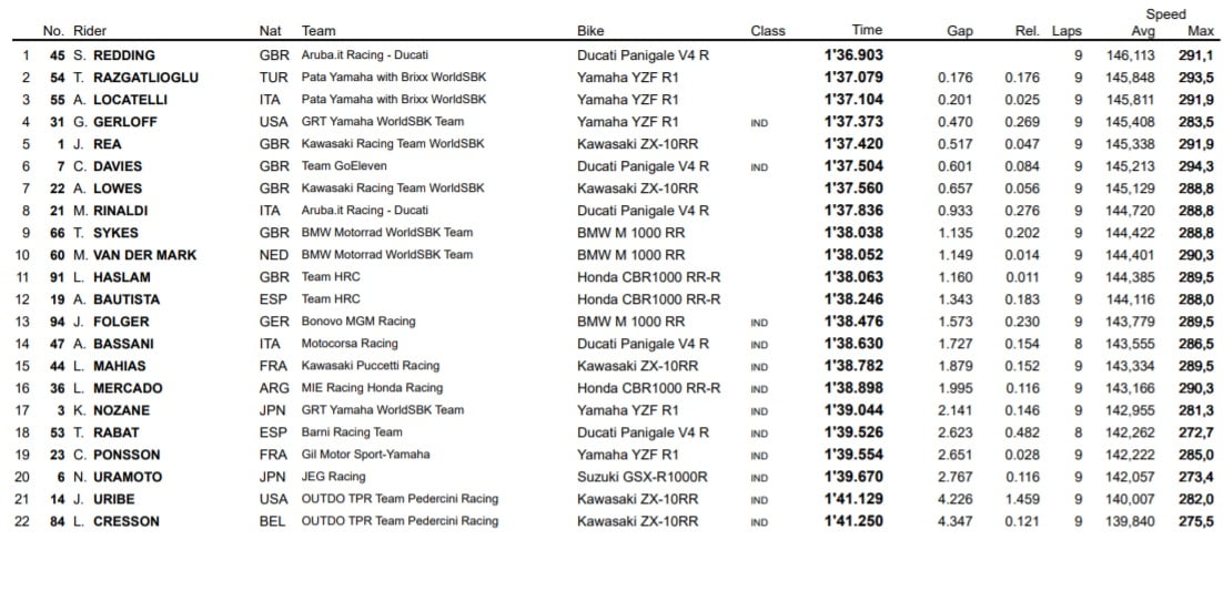Razgatlioglu a quant à lui pris un peu plus de temps à faire son apparition aux avant-postes, il termine le warm up à la deuxième place, juste devant deux autres pilotes Yamaha, à savoir Andrea Locatelli et Garrett Gerloff. Rea finit quant à lui au cinquième rang, devant Chaz Davies et Alex Lowes, alors que le top 10 est complété par Michael Ruben Rinaldi et les deux pilotes BMW Tom Sykes et Michael van der Mark, ce dernier ayant été victime d’une chute sans conséquence en toute fin de séance dans le dernier virage.