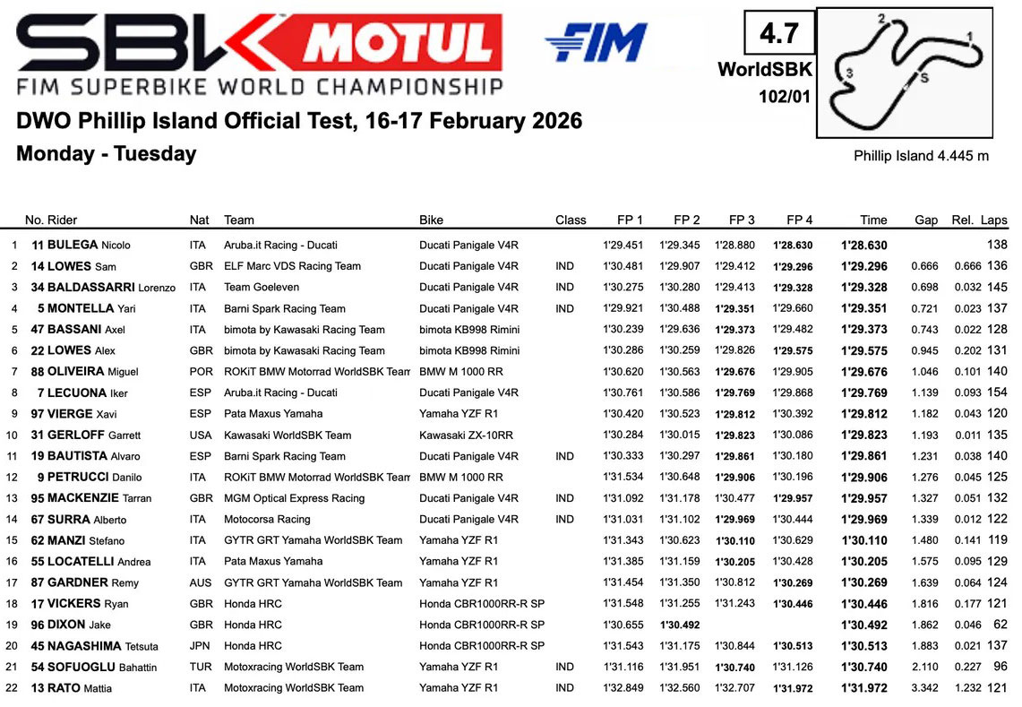 Sam Lowes : « Terminer deuxième au classement général et figurer parmi les trois premiers lors des deux journées d’essais à Phillip Island me rend très satisfait du travail accompli. C’était vraiment agréable de retrouver le rythme dans de bonnes conditions et de pouvoir enfin travailler sur la nouvelle moto. Je me sentais bien avec le pneu arrière à gomme dure, qui sera celui utilisé en course, et nous avons amélioré la moto lors de la dernière séance, ce qui nous a permis de faire un bon pas en avant. L’équipe a réalisé un travail fantastique pour améliorer la moto ces derniers jours. Je suis extrêmement reconnaissant pour l’énorme travail qu’ils ont accompli et j’apprécie vraiment le soutien que nous recevons de Ducati. Je me sens compétitif et confiant de pouvoir me battre pour de bons résultats ce week-end et bien démarrer notre saison 2026. »