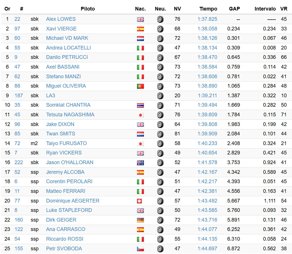 Auteur du meilleur temps en 1’37.825 au guidon de la Bimota KB4 998 Rimini, Alex Lowes a, en haut du tableau, pris le relais au fil des heures de Tetsuta Nagashima (Honda HRC), Michael van der Mark (Rokit BMW Motorrad) puis Xavi Vierge (Pata Maxus Yamaha).