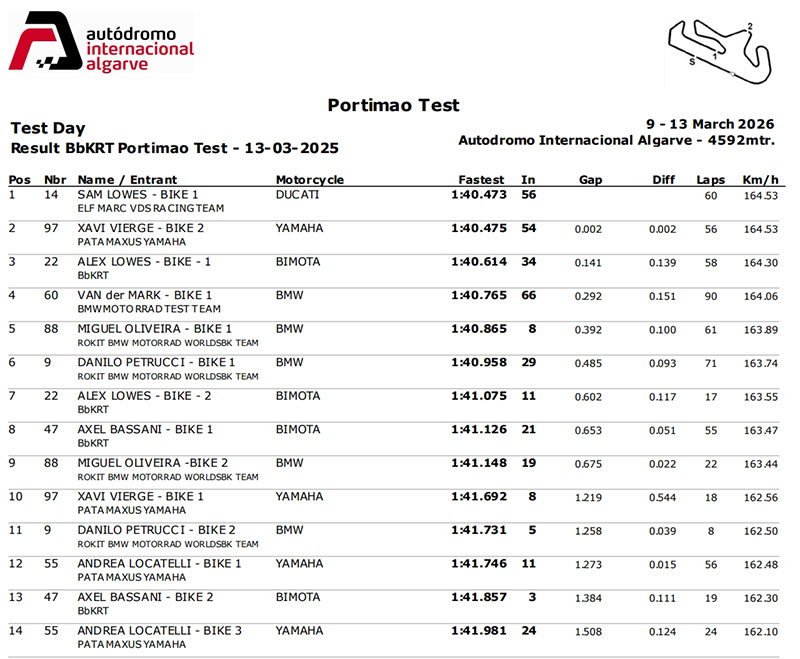 Superbike Test Portimāo chronos Superbike Test Portimāo chronos