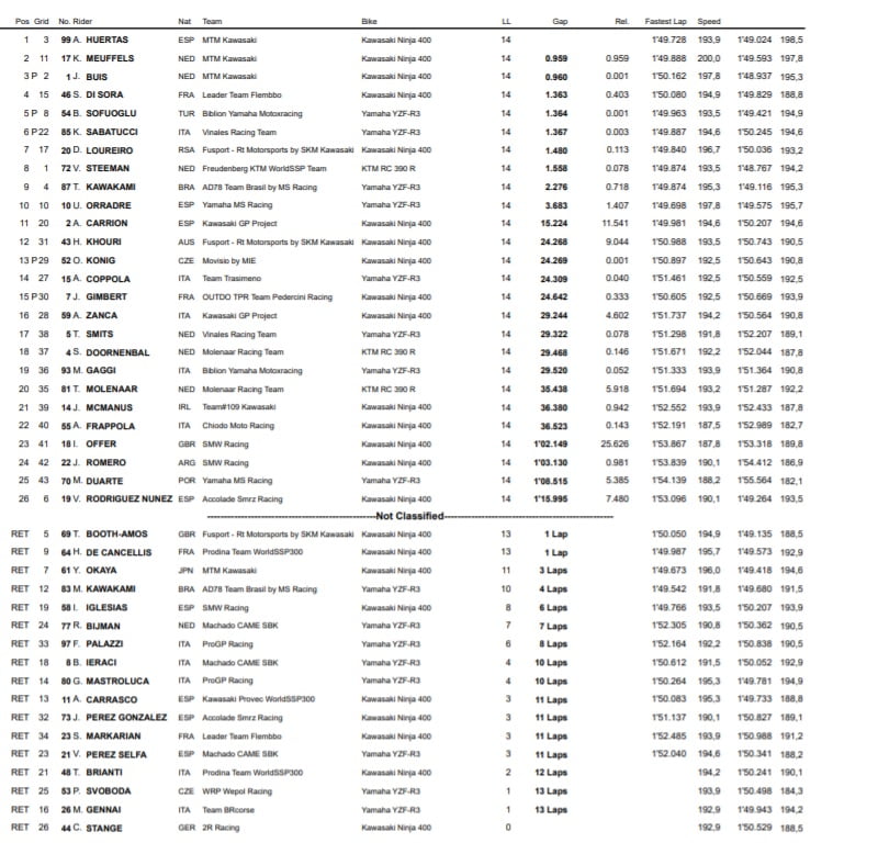 La bataille pour la tête de course s’est alors recentrée sur Adrian Huertas (MTM Kawasaki) et Jeffrey Buis (MTM Kawasaki). Un duel qui a finalement tourné à l’avantage du premier cité, le second faisant même l’objet d’une pénalité après le passage du drapeau à damier pour dépassement des limites de la piste.