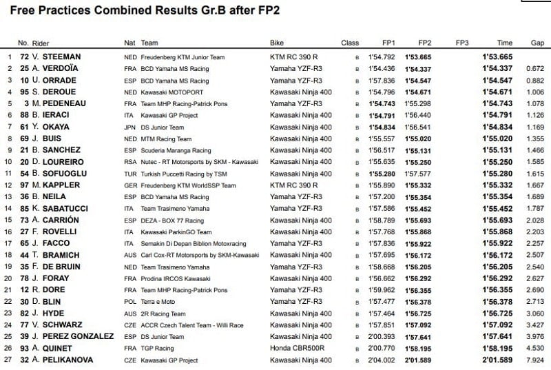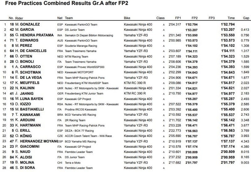 Manuel Gonzalez de l’équipe Kawasaki ParkinGO Team réalisait le meilleur chrono de la journée dans son groupe en 1’52.794, devant Marc Garcia (DS Junior Team) et Galang Hendra Pratama (Semakin Di Depan Biblion Motoxracing). Ils précédaient Tom Edwards, Mika Perez et le Français Hugo de Cancellis.