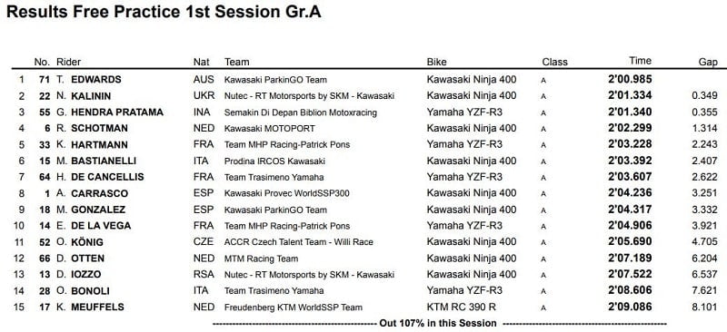 L’Australien Tom Edwards, de Wellington, était le plus rapide ce vendredi matin sur sa Kawasaki du ParkinGO Team alors que la piste était encore « verte » c’est-à-dire pas encore idéale pour le roulage rapide. Il s’en tirait toutefois très bien, devant le Russe Kalinin et l’Indonésien Hendra Pratama. Les Français Hartmann étaient cinquième, de Cancellis septième et de la Véga dixième.