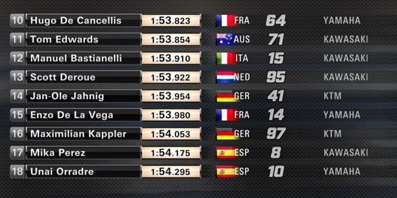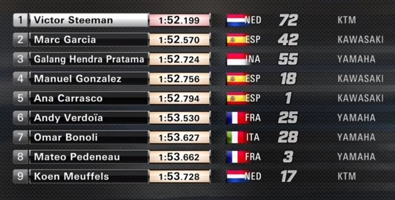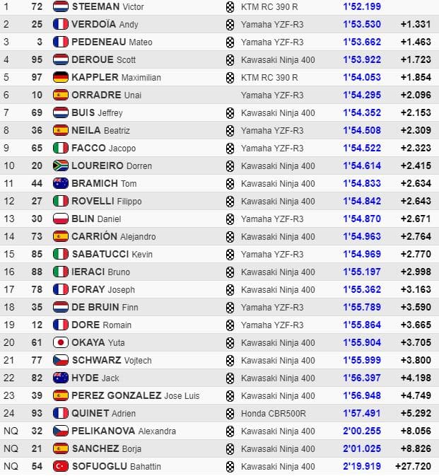 Bien que déjà leader, Victor Steeman continuait d’attaquer et améliorait nettement le meilleur temps absolu en 1’52.199 sur sa KTM RC 390 R, plus vite que le chrono le plus rapide du Groupe A. Verdoïa était à 1.3 de lui et Pedeneau troisième à 1.4. Scott Deroue remontait en quatrième position à 1.7. Les positions ne changeaient alors plus. Foray était 17e, Dore 19e et Quinet 24e.