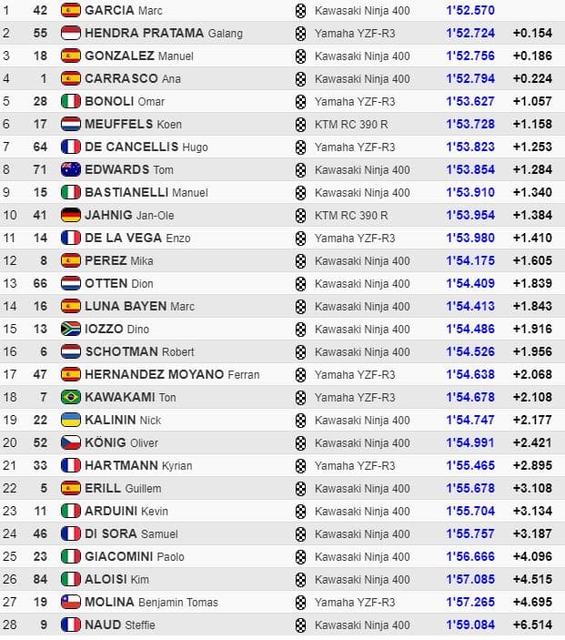 Galang Hendra Pratama réalisait la meilleure performance initiale en 1’53.102. Marc Garcia améliorait peu après en 1’52.570, le meilleur temps depuis le début du week-end. Kyrian Hartmann, alors dix-septième, chutait sans gravité dans le Virage 10. Il se relevait immédiatement, mais il ne lui restait plus que 8 minutes pour se qualifier.