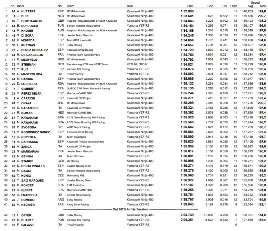 La catégorie a même ouvert le bal en tout début de matinée, sur une piste détrempée qui a causé bien des problèmes aux pilotes. Malgré cela, le leader du championnat Adrian Huertas (MTM Kawasaki) s’était emparé dans cet environnement difficile du meilleur temps, avant de confirmer par la suite lors des FP2 dans des conditions autrement plus favorables.