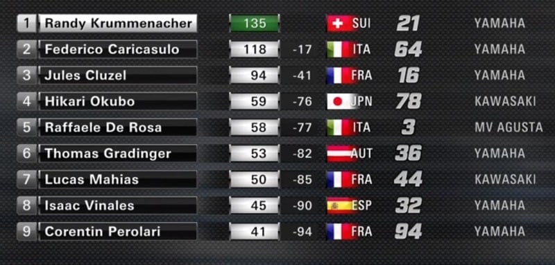 Randy Krummenacher menait toujours devant Federico Caricasulo, mais Jules Cluzel en troisième position plongeait à l’intérieur de Caricasulo et lui ravissait la deuxième position.