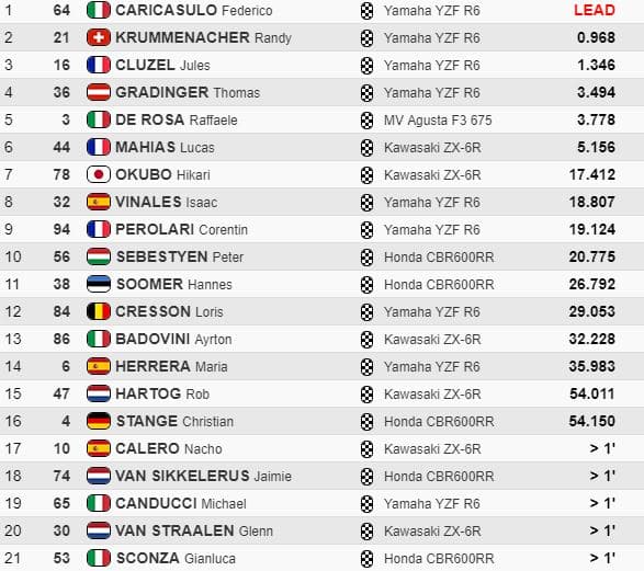 Caricasulo rentrait en tête dans les deux derniers tours devant Krummenacher, Cluzel, de Rosa, Gradinger et Mahias. Caricasulo creusait un petit écart de 0.6, avec le meilleur tour en course en 1’42.532. Sous le drapeau à damier, Federico Caricasulo l’emportait magnifiquement devant Randy Krummenacher, Jules Cluzel, Thomas Gradinger, Raffaele de Rosa et Lucas Mahias, tandis que Corentin Perolari terminait neuvième.