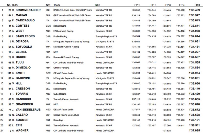 Leader pendant le début de ces essais, le Champion du Monde en titre Lucas Mahias s’est classé deuxième devant les autres Yamaha de Federico Caricasulo et Sandro Cortese. La R6 semblerait avoir les faveurs du pronostic.