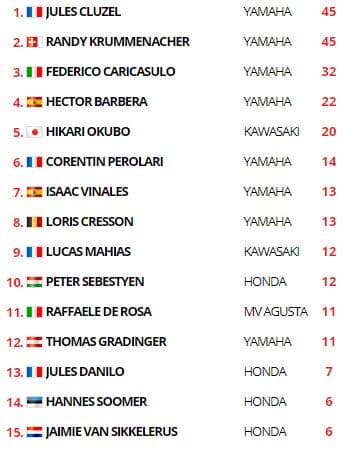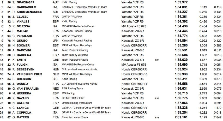 Raffaele de Rosa réalisait ce samedi une excellente opération en s’emparant du meilleur temps de la première séance d’essais libres, alors que la deuxième était décimée par la pluie. Jules Cluzel se classait habilement deuxième avant la Superpole du Samedi, tandis que Federico Caricasulo était quatrième, Randy Krummenacher sixième, et Lucas Mahias huitième juste devant Corentin Perolari.