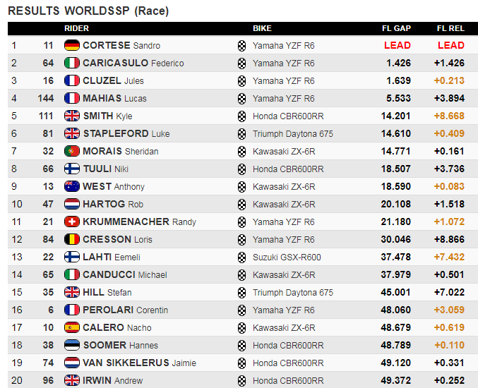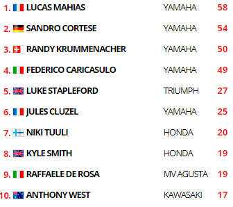 Cortese remportait la victoire, devenant le troisième vainqueur différent cette année avec Mahias et Krummenacher. Le Suisse terminait onzième et Corentin Perolari seizième. Au Championnat du Monde, Lucas Mahias réalisait une très bonne opération. Et un grand bravo à Jules Cluzel pour sa belle troisième place.
