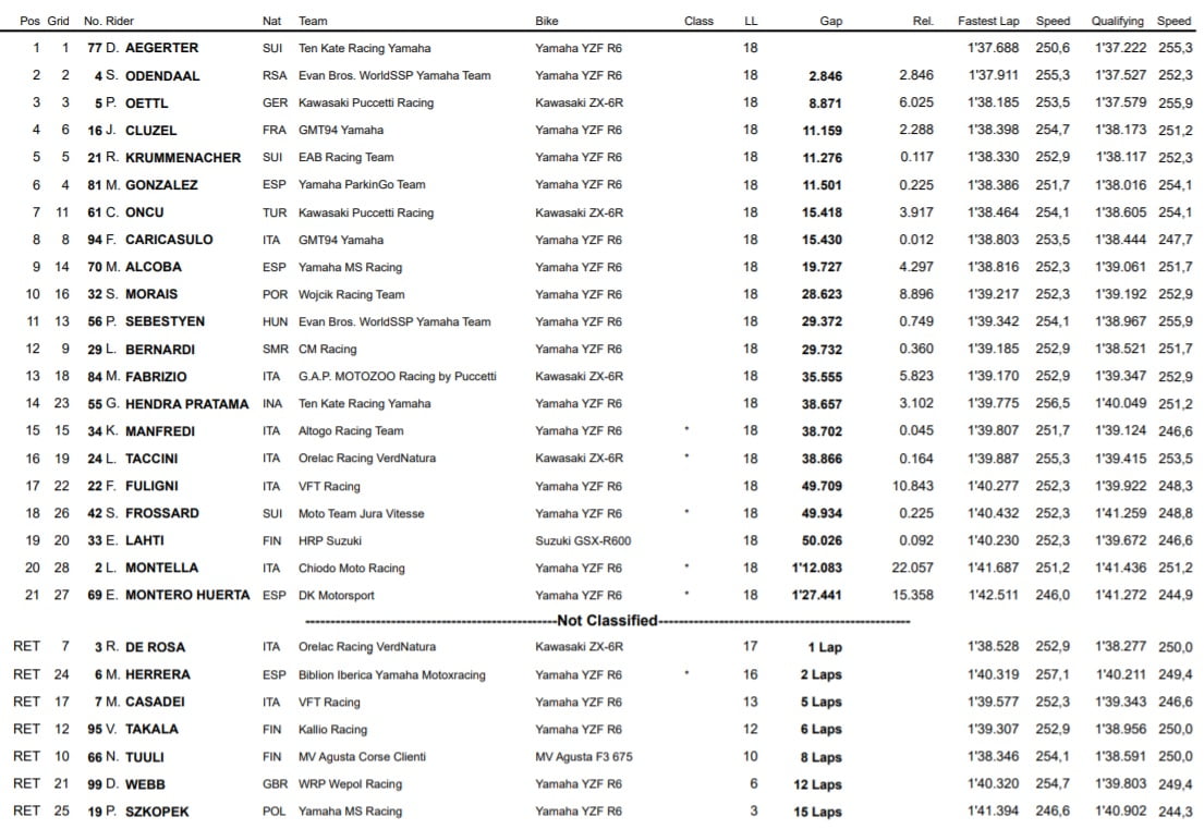 Gonzalez n’a cependant pas réussi à tenir la distance face à des adversaires déchaînés derrière lui, et notamment Jules Cluzel qui, parti depuis la septième position sur la grille, a mené une très belle course pour, dans un premier temps, s’installer à la cinquième place avant de tailler des croupières dans les dernières encablures à Randy Krummenacher pour finir au quatrième rang sous le drapeau à damier. L’Auvergnat boucle ainsi cette première course devant le pilote suisse ainsi que Gonzalez et Can Öncü. Au rang des déceptions, on peut citer la chute de Niki Tuuli qui semblait pourtant bien parti pour signer un résultat probant aux pays-Bas.