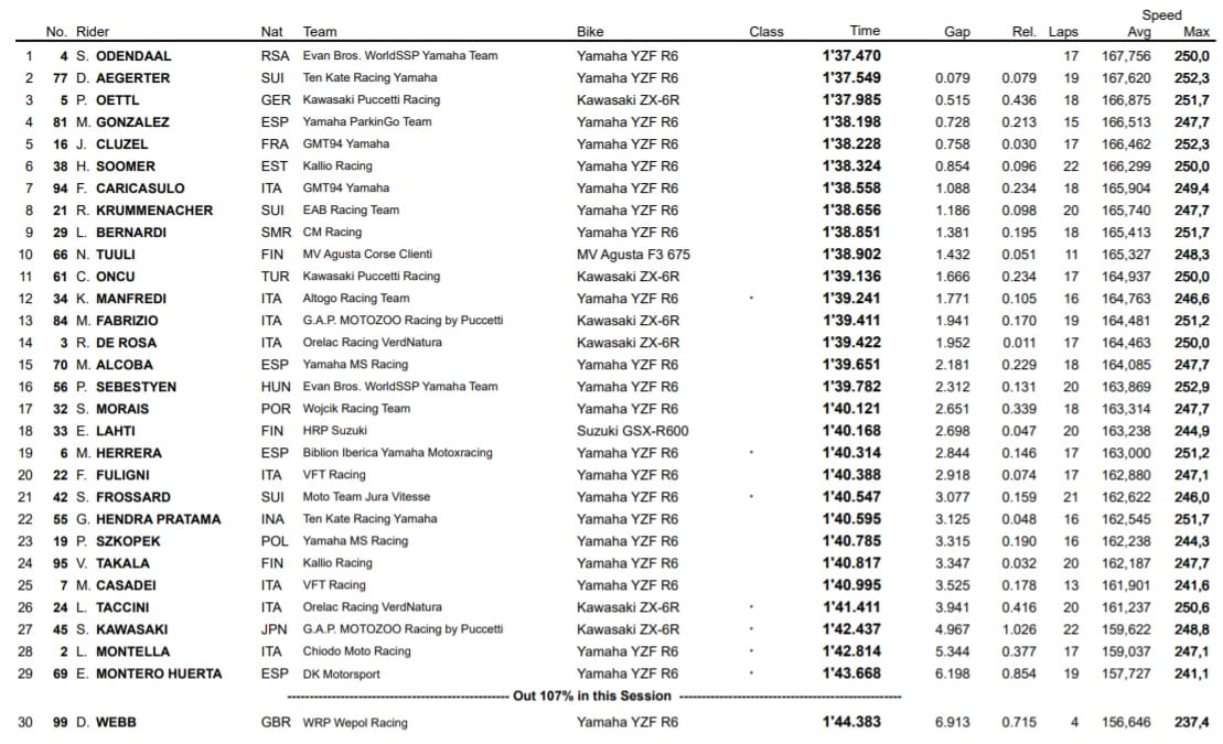 Et comme dans le championnat des motos dérivées de la série, la trêve estivale a dû paraître bien longue pour les deux leaders du classement général, Dominique Aegerter et Steven Odendaal. Les deux hommes ont en effet assuré le spectacle au cours des trois premières manches de la saison, remportant la totalité des courses en jeu jusqu’ici, avec pour l’instant une égalité parfaite à six victoires partout.