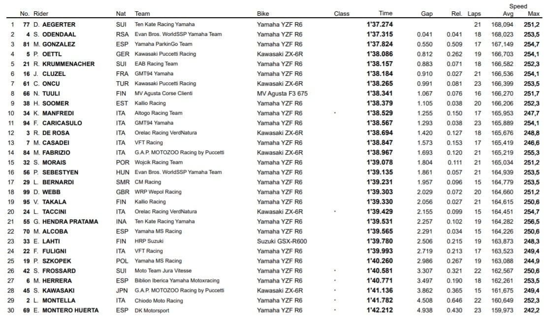 Si, aux avant-postes, on a très rapidement compris que la première place allait donc se jouer entre Aegerter et Odendaal, derrière, la situation a considérablement évolué au fil des minutes. La troisième place a notamment fait l’objet d’une rude bataille entre Randy Krummenacher et Manuel Gonzalez, avant que Shogo Kawasaki ne soit victime d’une lourde chute dans le virage 15 à cinq minutes du terme, forçant les commissaires à brandir le drapeau rouge et provoquer ainsi l’interruption de la séance. Le pilote japonais a été transporté au centre médical du circuit pour passer une batterie d’examens.