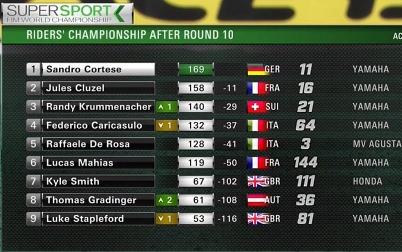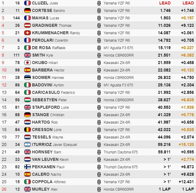 Un groupe de six pilotes restait au commandement avec Cluzel, Mahias, Caricasulo, Cortese, Perolari et Gradinger, tous sur Yamaha R6. A 12 tours du drapeau à damier, Sandro Cortese s’emparait de la deuxième position en doublant Mahias et Caricasulo. L’Allemand avait désormais Jules Cluzel juste devant lui.