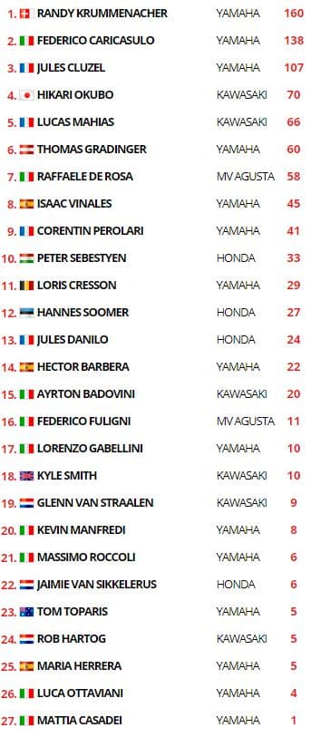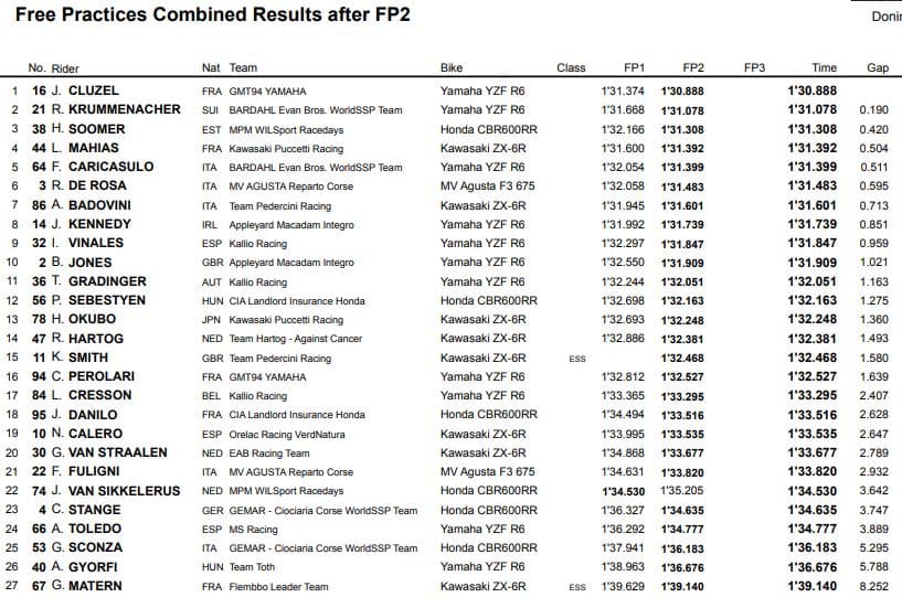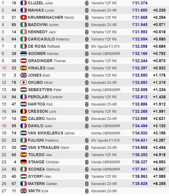 Cluzel continuait son festival en 1’30.888. Krummenacher répliquait en 1’31.078 à 0.190 du pilote du GMT94 Yamaha. Hannes Soomer complétait le tiercé provisoire en 1’31.308, à 0.4 de Cluzel. Lucas Mahias occupait la quatrième place devant Caricasulo et de Rosa, tandis que Perolari pointait seizième et Danilo dix-huitième.