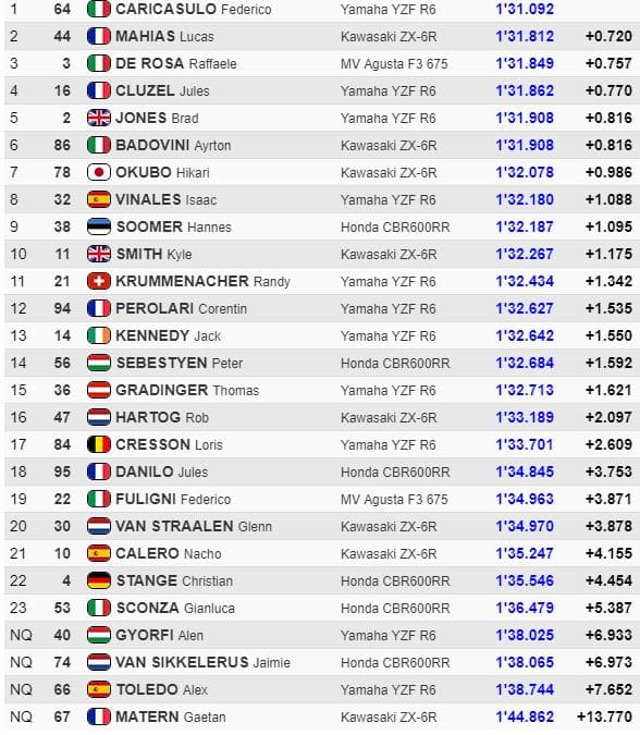 Jules Cluzel (GMT94 Yamaha) avait magnifiquement dominé la première journée devant Randy Krummenacher (Bardahl Evan Bros. WorldSSP Team), Hannes Soomer (MPM WILSport Racedays), Lucas Mahias (Kawasaki Puccetti Racing), Federico Caricasulo (Bardahl Evan Bros. WorldSSP) et Raffaele De Rosa (MV Agusta Reparto Corse).
