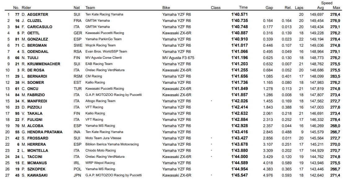Mais les deux hommes se sont fait coiffer au poteau par une troisième Yamaha, alignée par Ten Kate, celle de Dominique Aegerter. Le pilote suisse a sorti un sublime tour de son chapeau pour prendre l’avantage avec un chrono de 1’40.571. Une référence qui lui a permis de terminer la séance avec 0.164 de marge sur Cluzel et 0.177 sur Caricasulo.