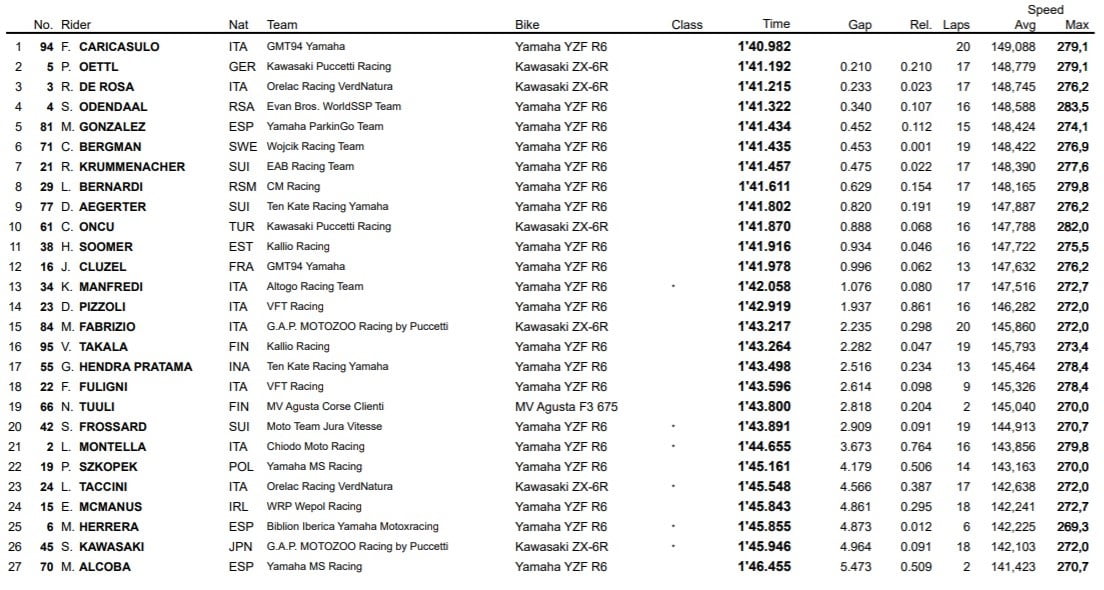 Federico Caricasulo a signé la première référence chronométrique en Supersport, devant Philipp Öttl et Raffaele de Rosa.