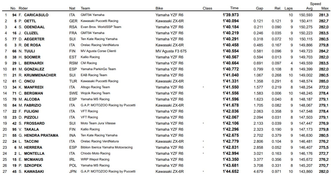 Les 20 minutes de la Superpole ont été particulièrement animées, donnant lieu à une bataille acharnée pour le gain de la première place sur la grille. Caricasulo, déjà meilleur temps hier à l’issue des FP1, a remis ça dès le début de la séance en s’emparant des rênes du classement.