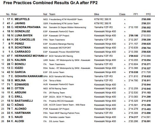 Dans le Groupe A, Koen Meuffels (Freudenberg KTM WorldSSP Team) précédait Jan-Ole Jahnig (Freudenberg KTM Junior Team), Galang Hendra Pratama (Semakin Di Depan Biblion Motoxracing), Manuel Gonzalez (Kawasaki ParkinGO Team) et Marc Bayen Luna (Kawasaki GP Project). Ana Carrasco n’était que huitième.