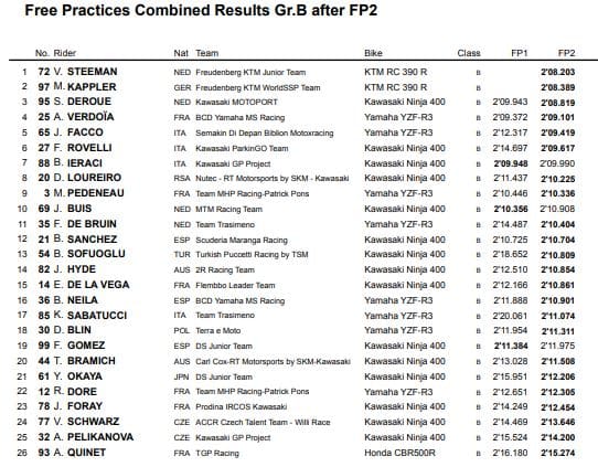 Dans le Groupe B, Victor Steeman (Freudenberg KTM Junior Team) devançait Maximilian Kappler (Freudenberg KTM WorldSSP Team), Scott Deroue (Kawasaki Motorsport) et le Français Andy Verdoia (BCD Yamaha MS Racing).