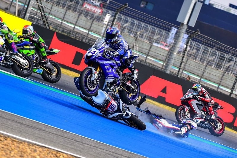 Dans le cas de Corentin comme dans celui du Tchèque, la raison fut exactement la même, c’est-à-dire avec la moto du pilote qui le précédait qui se couchait devant sa roue avant et ne laissait aucune chance au pilote qui suivait. Pour ne pas chuter une fois redescendu des airs, il fallait bien sûr un peu de chance, mais aussi beaucoup d’adresse pour retomber sur ses roues.