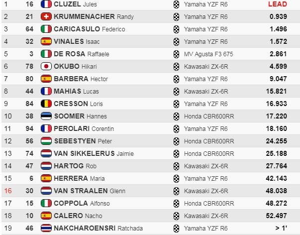 « J’ai pris un assez bon départ, puis dans le premier virage Badovini a chuté. Il était en plein milieu de la piste donc j’ai dû relever pour ne pas le percuter. C’est sa moto que j’ai percutée et ensuite j’ai fait un peu de cross. Je suis retombé sur l’avant un peu de travers, et ensuite j’étais loin du bord de la piste, à la sortie des stands. Je suis presque allé dans la terre, hyper loin de la piste. Ensuite je suite reparti loin derrière le dernier, puis je suis bien remonté ».