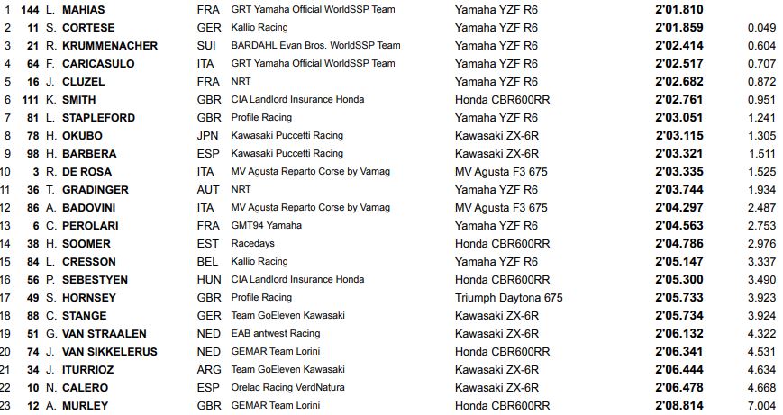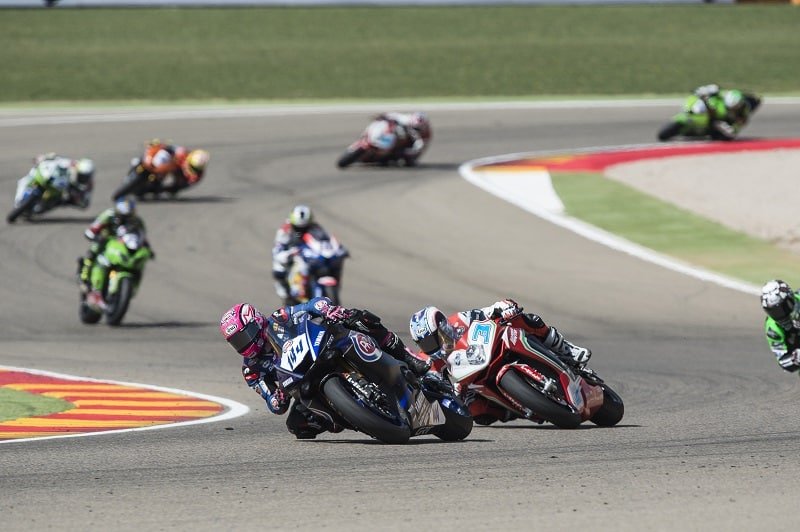 Lors de la manche portugaise du Championnat du Monde Supersport, Lucas Mahias l’emportait devant son coéquipier Caricasulo. La course était arrêtée au drapeau rouge en raison d’un incident dans le virage 11, et le résultat était donc déterminé par le classement à l’avant-dernier tour. Cela faisait bien les affaires de Lucas Mahias, victime de son pneu arrière à plat en commençant le dernier tour ! Puis le classement était de nouveau changé par les officiels car Mahias n’avait pas complété un tour entier du circuit pour revenir aux stands et Caricasulo était déclaré vainqueur devant Smith et de Rosa.
