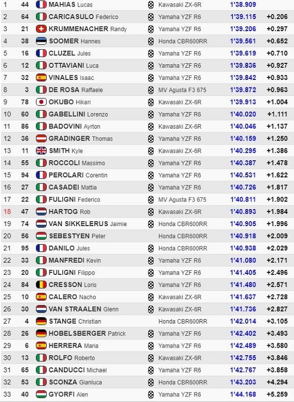 Federico Caricasulo (Bardahl Evan Bros. WorldSSP Team) était fin prêt à affronter la Superpole, ayant vendredi réalisé un temps de 1’39.951 devant Raffaele De Rosa (MV Agusta Reparto Corse) à 0.185, qui précédait Randy Krummenacher (Bardahl Evan Bros WorldSSP Team), Jules Cluzel (GMT94 Yamaha), Lucas Mahias (Kawasaki Puccetti Racing), Hannes Soomer (MPM WILSport Racedays), Luca Ottaviani (SGM Tecnic), Lorenzo Gabellini (Gomma Racing), Ayrton Badovini (Team Pedercini Racing) et Isaac Viñales (Kallio Racing).
