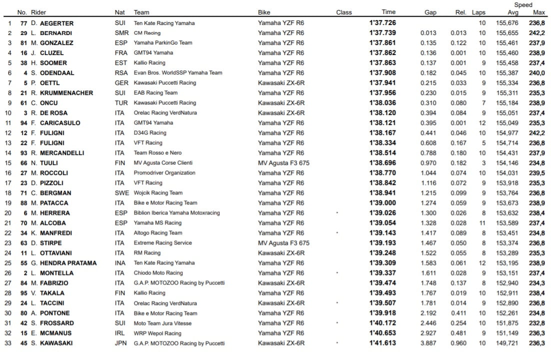 C’est finalement le pilote suisse qui a été le plus rapide de la séance, signant ainsi sa première Superpole dans la catégorie devant Luca Bernardi et Manuel Gonzalez. Ce dernier n’a pas réussi à convertir sa domination lors des essais libres en Superpole aujourd’hui, mais devrait être en mesure de jouer la victoire cet après-midi à l’occasion de la Course 1.