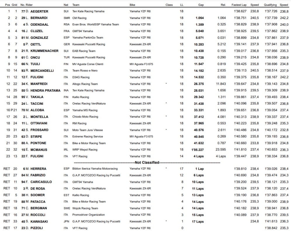 WSBK Supersport Misano Course 1 : Aegerter enchaîne, Cluzel au pied du podium