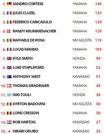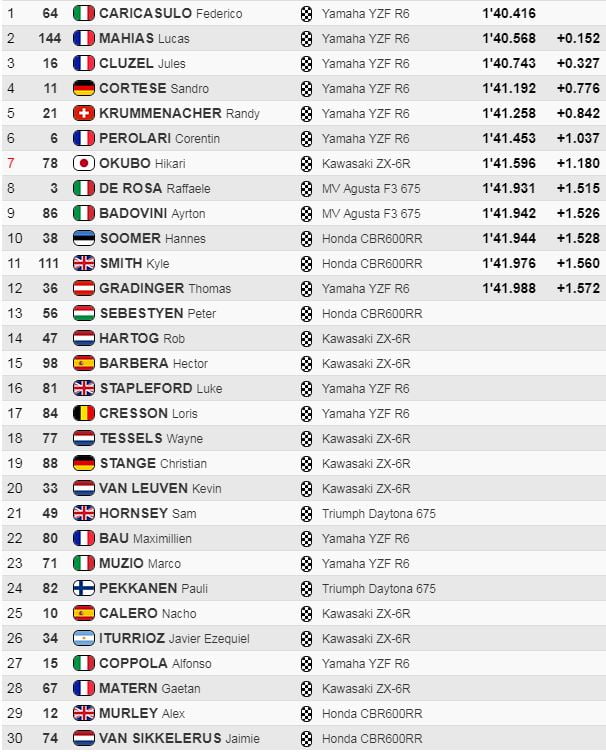 Federico Caricasulo battait le record en 1’40.416 et s’emparait de la pole position devant Lucas Mahias et Jules Cluzel. Cortese devait se contenter de la deuxième ligne après sa chute, d’où il s’élancera avec Randy Krummenacher et le brillant Corentin Perolari.