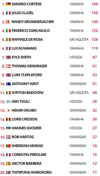 Pour que Cortese soit Champion du Monde ce dimanche, il faut qu’il remporte la course, et que Cluzel finisse 6e ou plus. Si Cortese termine second, Cluzel doit finir 11e ou plus, et Randy Krummenacher doit terminer troisième ou plus. Si Cortese termine troisième, Cluzel doit finir 15e ou plus, et Krummenacher doit terminer 4e ou plus.