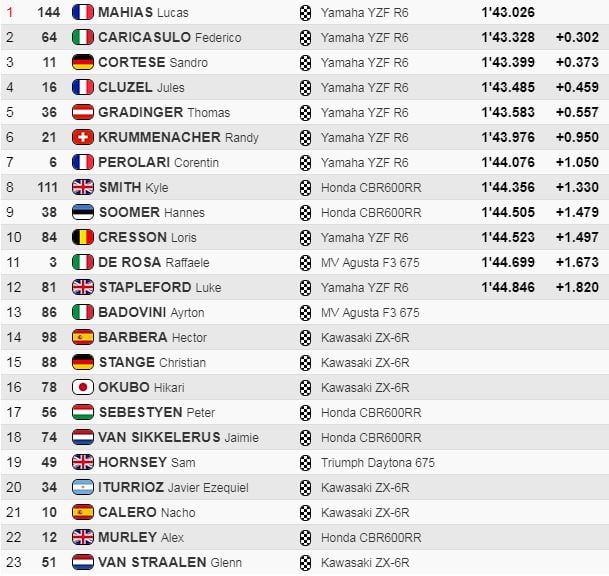 A l’issue des séances d’essais libres du vendredi servant à déterminer les concurrents admis en Superpoles, le meilleur temps revenait à Lucas Mahias (GRT Yamaha Official WorldSSP Team) 0.083 devant Jules Cluzel (NRT) et Federico Caricasulo (GRT Yamaha Official WorldSSP Team). Suivaient ensuite Thomas Gradinger (NRT), Randy Krummenacher (Bardahl Evan Bros WorldSSP Team), Kyle Smith (CIA Landlord Insurance Honda), Raffaele De Rosa (MV Agusta Reparto Corse by Vamag), Sandro Cortese (Kallio Racing) qui eut son moteur cassé en FP1, Luke Stapleford (Profile Racing) et le pilote français de Christophe Guyot Corentin Perolari (GMT94 Yamaha).