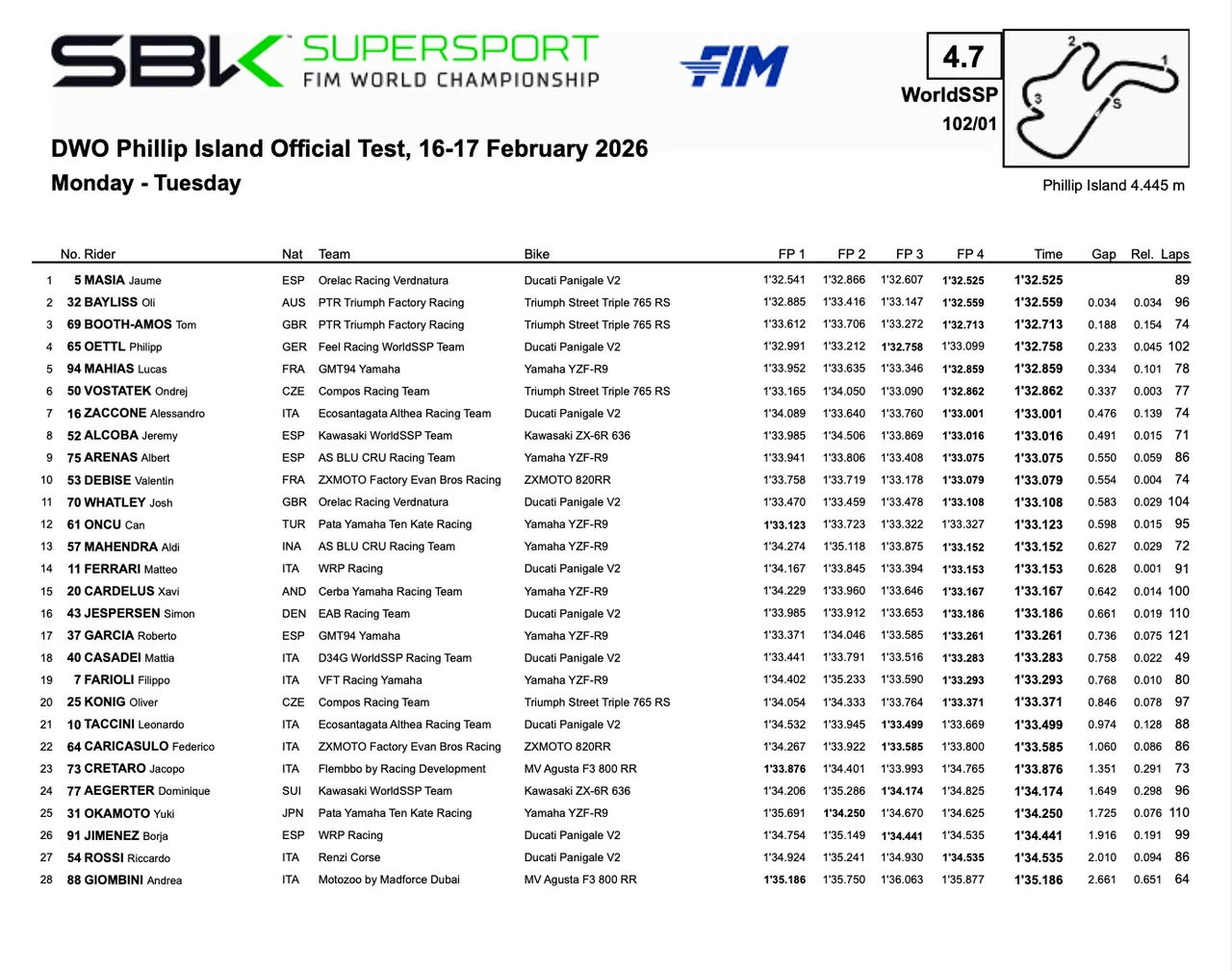 Le test Supersport de pré-saison à Phillip Island, en Australie, est maintenant terminé, et à l’image de Nicolo Bulega en Superbike, Jaume Masia (Orelac Racing VerdNatura) y a dominé les quatre séances, également sur une Ducati !
