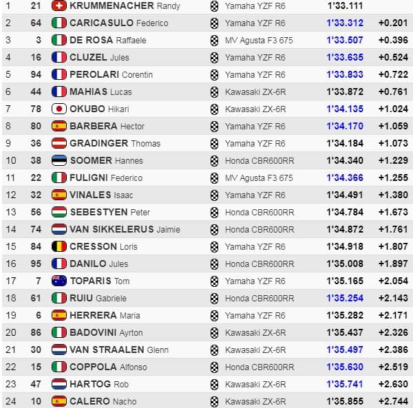 Raffaele De Rosa (MV Agusta Reparto Corse) pointait au cinquième rang, ce qui permettait à trois constructeurs différents d’être pointés parmi les cinq premiers. Corentin Perolari était au neuvième rang de la hiérarchie, à trois dixièmes de son coéquipier Cluzel. Lucas Mahias et Jules Cluzel avaient chuté sans gravité.