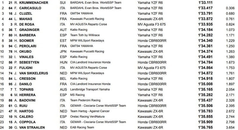 La première journée d’essais avait été dominée par les Yamaha de Randy Krummenacher et Federico Caricasulo, coéquipiers au sein du team Bardahl Evan Bros, avec un meilleur temps de 1’33.820. Les Français étaient en embuscade avec Jules Cluzel troisième sur une R6 du GMT94, devant Lucas Mahias (Kawasaki Puccetti Racing).