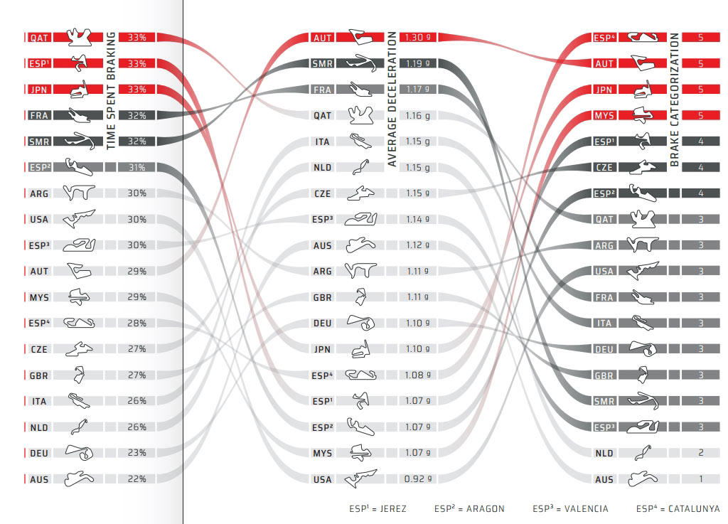 Les 18 circuits du calendrier MotoGP diffèrent à la fois en qualité de freinage et quantité. Les 18 circuits sont classés ci-dessus en fonction de 3 indices de difficulté différents :